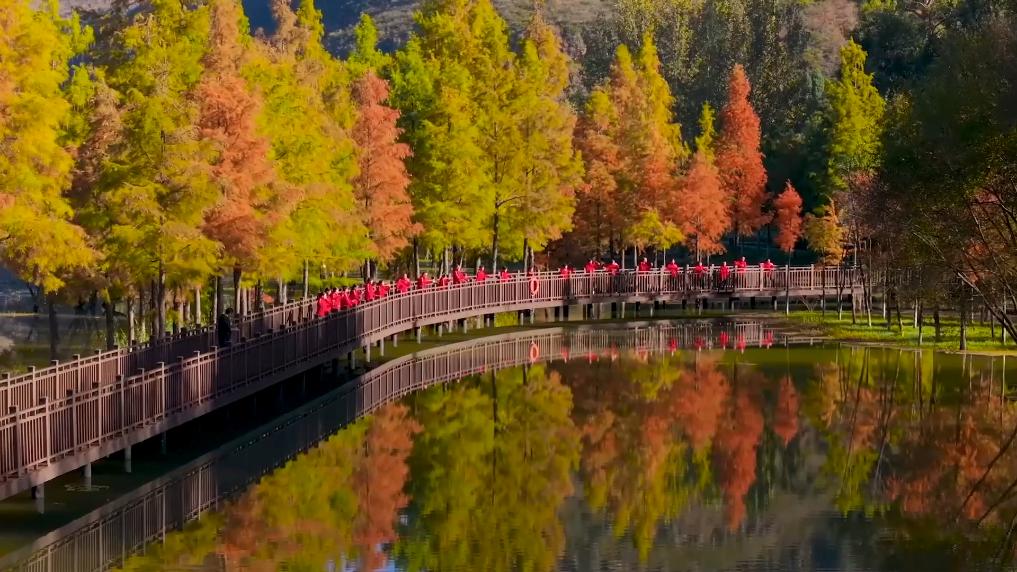 初冬,云南省大理白族自治州洱源县茈碧湖湿地迎来最佳观赏期。晴空之下,水天一色,水杉、栈道、候鸟同时入镜,冷暖色调相互映衬,形成了一幅色彩斑斓的山水画卷,吸引了众多游客前来观赏。