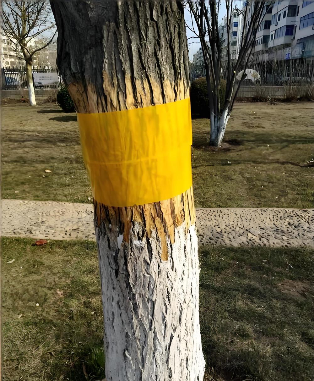 (一)阻隔法:根据草履蚧若虫孵化向上爬的趋性,阻隔法是防治的最有效办法。1.树干阻隔法。时间与材料:在草履蚧若虫上树前(2月上中旬)或成虫下树产卵前(5月中下旬),于树干离地面50-80厘米处,刮平树皮裂缝后缠绕宽15-30厘米的透明塑料膜或专用粘虫带,形成光滑或粘性阻隔环,阻止虫体攀爬。在缠胶带的下部还可以涂抹拦虫虎等药剂杀灭被阻隔若虫。2.房屋周边防护。对居民楼外墙基部、门窗缝隙喷洒黏虫胶或涂抹废机油混合液(1:1比例),阻止草履蚧爬至墙上及进入室内。
